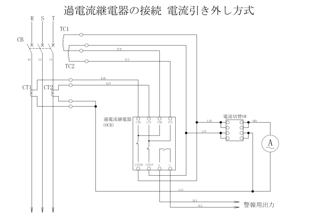 以下に回路図の例を記載します。過電流継電器各端子の名称はメーカーによって違いますので選定の過電流継電器に合わせて読み替えてください。また、過電流継電器内部に接点のみを図示します。演算回路等は記載しておりませんので誤解の無いように注意してください。